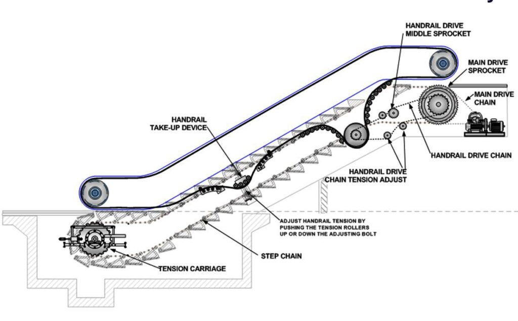 Inspection includes verification of the handrail system, handrail drive mechanism, and synchronization between the handrail speed and step movement. Passenger contact areas such as handrails must operate smoothly and safely to provide stability for users.